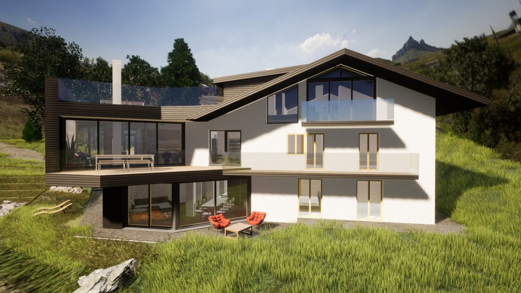 Eine harmonische Verschmelzung von Neu und Alt, eingebettet in eine Landschaft von atemberaubender Schönheit. Raumgreifende Fenster mit spektakulären Blickwinkel lassen die grandiosen Bergpanoramen gleich in den Wohnräumen einstrahlen. Die spannende Geländeverhältnisse werden unter Einsicht höchster Nachhaltigkeitsansprüche ausgeschöpft und respektieren gleichzeitig die Umgebung.